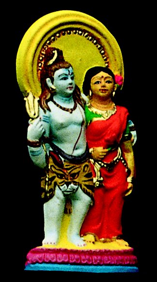 Parvati and Shiva Godhead as Beneficent Union. Here Parvati, the beneficent Shakti, stands in a relaxed pose united with Shiva, who holds his trident and drum, the symbols of creation. In this conjunction we see Godhead as fertility and order. Parvati represents at one and the same time both the penultimate creative energy of the god as well as a benevolent intercessor conjoined with godhead on behalf of any devoted supplicant. Parvati's fiercer nature is subsumed in her identities of Durga-devi and Kali, but here that nature is restrained and balance prevails. This is an image of Divine Harmony